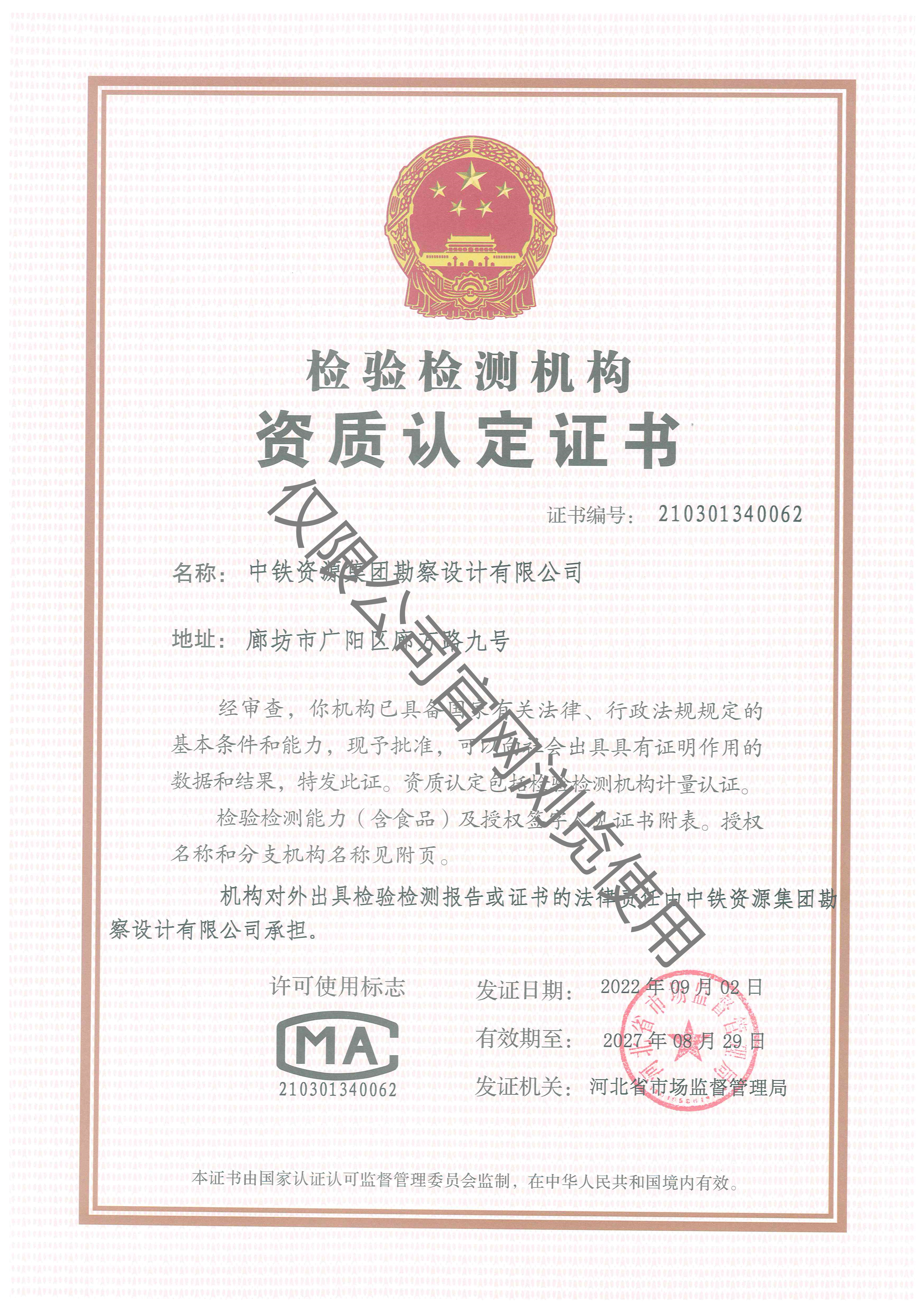 檢驗(yàn)檢測機(jī)構(gòu)資質(zhì)認(rèn)定證書